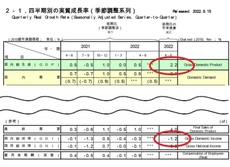 2022年4月~6月期の実質GDP(季節調整済み)は、年率換算でプラス2.2%となり、コロナ前に戻ったと楽観視する意見もありますが、国内で生み出された所得であるGDI(実質)は年率でマイナス1.2%で、輸入品価格の上昇が国民生活をより厳しいものにしています。(※1)