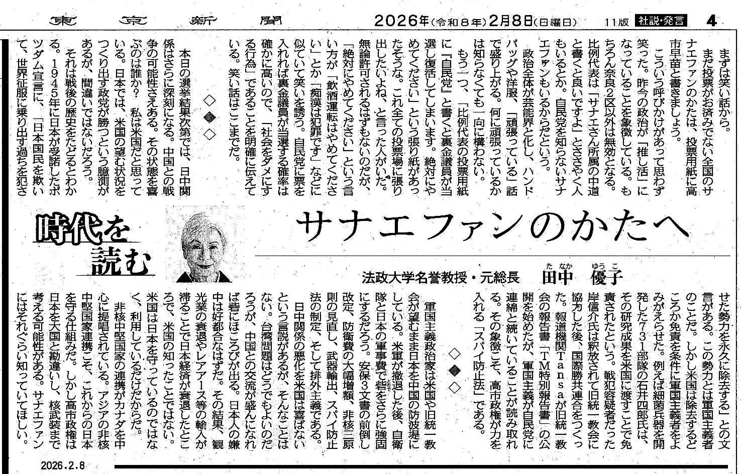 ※3:サナエファンのかたへ 田中優子・法政大学名誉教授・元総長(東京新聞)