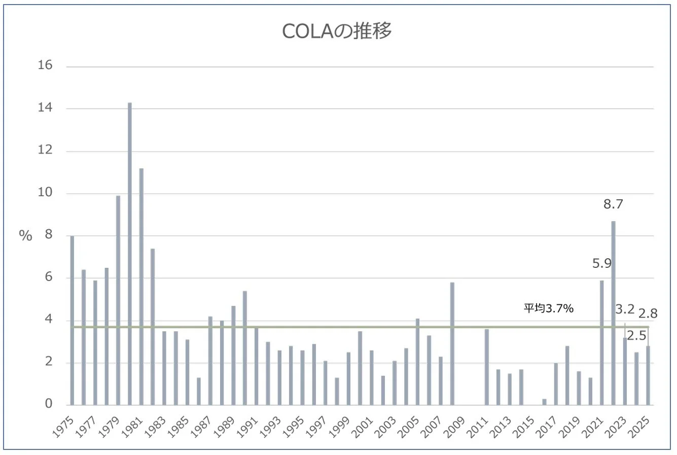 今年は、政府機関閉鎖により9月のCPIが10月末まで発表されず、COLAの確定も例年より遅れました。2025年のCOLAは2.8%となり、2026年1月の給付から適用されます。例えば、2025年の受給額が$1,976(ソーシャル・セキュリティ給付月額平均値)の場合、来年1月から$55.3の増額となります。