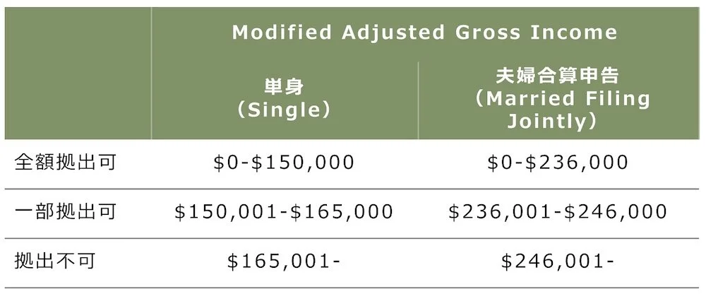 Traditional IRAの拠出額所得控除、Roth IRAへの拠出については所得による制限がありますので、ご注意ください。